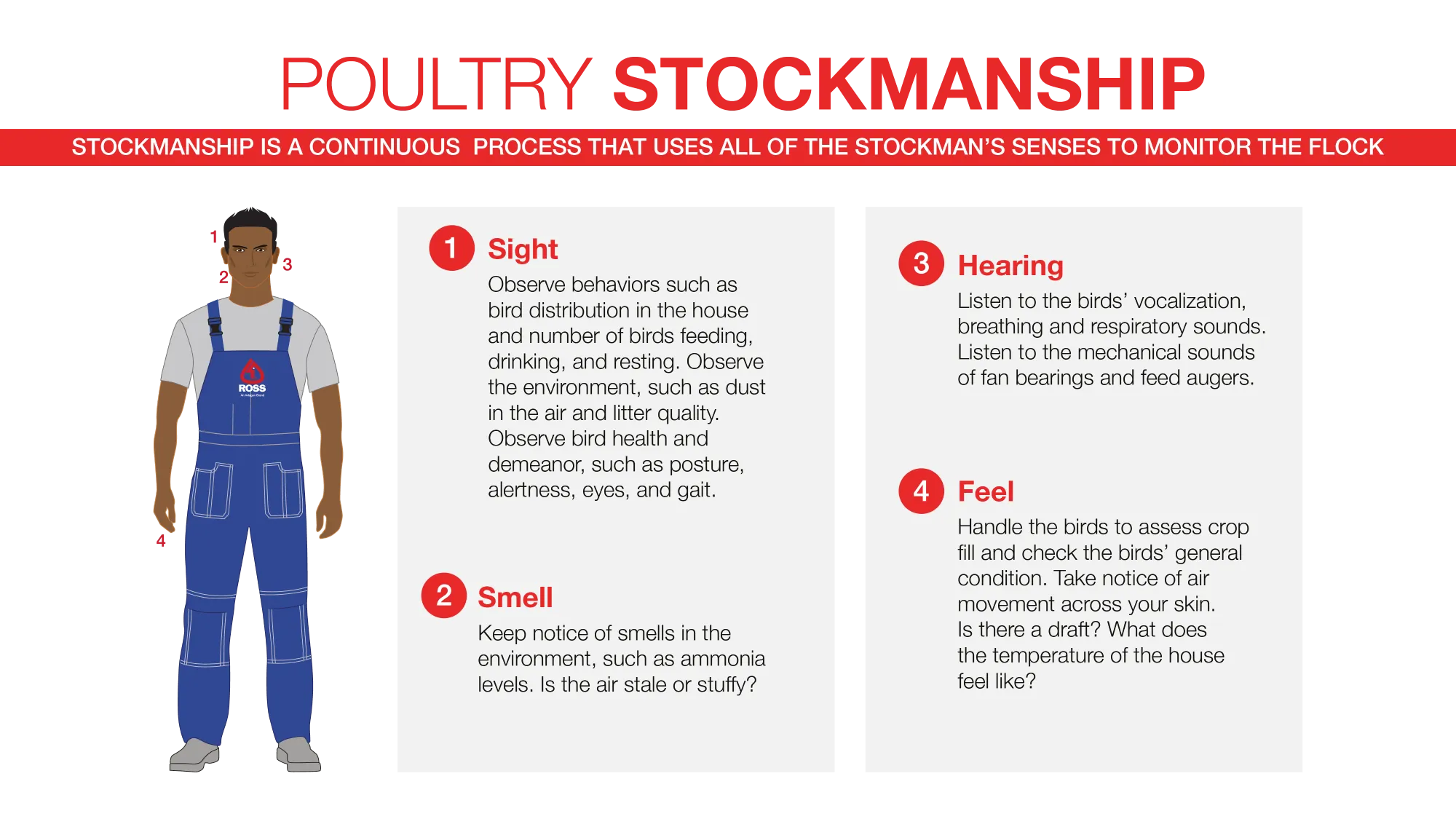 Every stockman has to be in tune with and aware of the birds in the flock and their environment by closely monitoring the birds’ behavioral characteristics and the conditions within the poultry house. This monitoring is commonly referred to as ‘stock sense’ and is a continuous process that uses all the stockman’s senses.
